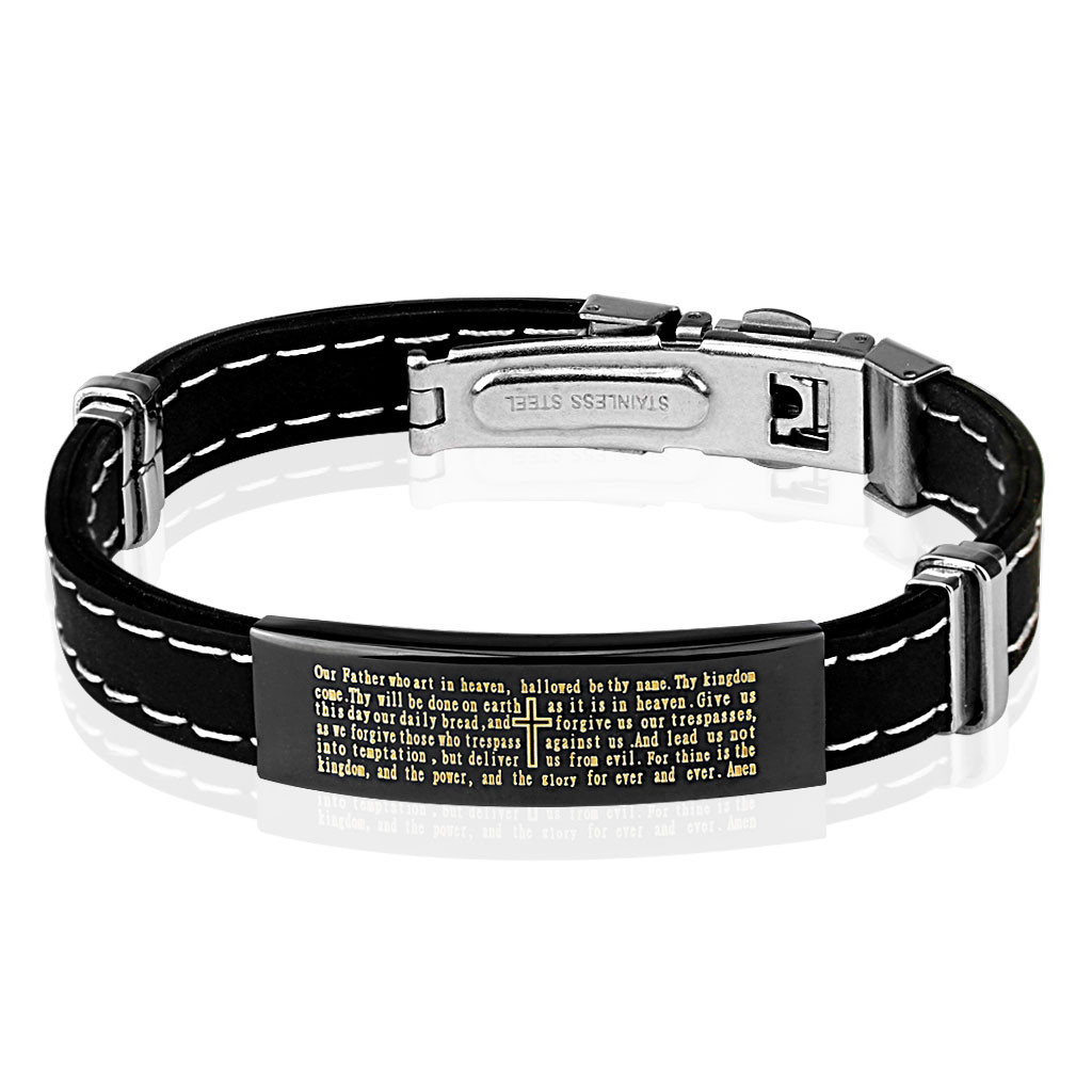 Gumový náramek černé barvy s bílým prošíváním, podlouhlá známka v černé barvě, "otčenáš", latinský křížek, zapínání hodinkové. U nás najdete pouze produkty prověřených prodejců, Přejeme vám příjemné nakupování.