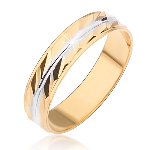 Popis produktu Obroučka zlaté barvy se šikmými rýhami a stříbrným středovým zářezem - Velikost: 51
