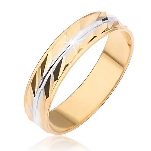 Dvoubarevný prsten s lesklým povrchem, stříbrný středový zářez, diagonální rýhování na zlatých pásech.Ceny zboží a skladovou dostupnost neustále aktualizujeme. Přejeme vám příjemné nakupování.
