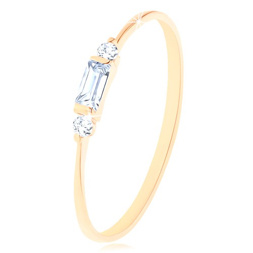 Popis produktu Prsten ve žlutém 14K zlatě - zirkonový obdélník čiré barvy, dva kulaté zirkonky - Velikost: 57