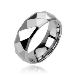 Wolframový prsten ve stříbrném odstínu, vybroušené kosočtverce a trojúhelníky po celém obvodu, tenké zkosené okraje.U nás najdete pouze produkty prověřených prodejců, Využijte nabídku dřív, než dojde k vyprodání zboží.