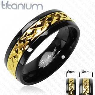 Prsten černé barvy z titanu - ozdobně vyřezávaný pás ve zlatém barevném odstínu, pyramidky.Zboží zařazené v našem katalogu vás nezklame. Nakupování na internetu je výhodnější než v kamenné prodejně, která má vyšší náklady.