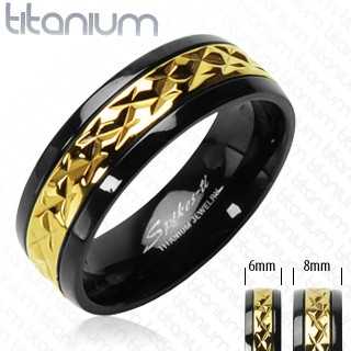 Popis produktu Titanový prsten černý se vzorovaným pruhem zlaté barvy - Velikost: 57