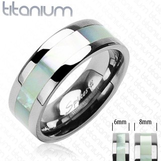 Prsten z titanu ve stříbrném odstínu, s perleťovým středovým pruhem.Zboží zařazené v našem katalogu vás nezklame. Přejeme vám příjemné nakupování.