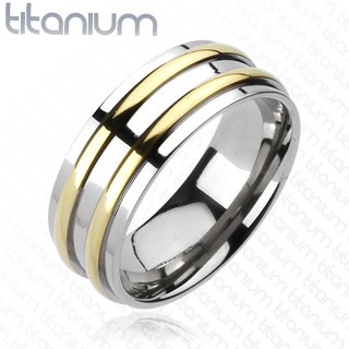Titanový prsten - stříbrný, dva zlaté pásky - Velikost: 59