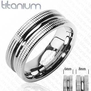 Titanový snubní prsten s lesklým středovým pruhem a vroubkovanými okraji.Naše výhodné nabídky čekají právě na vás. Udělejte si radost.