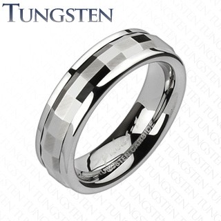 Prsten z wolframu se středovým pásem, který je zdoben obdélníky kovové barvy.Doporučujeme také ostatní produkty z nabídky e-shopu. Lepší nabídku už na trhu hledat nemusíte.