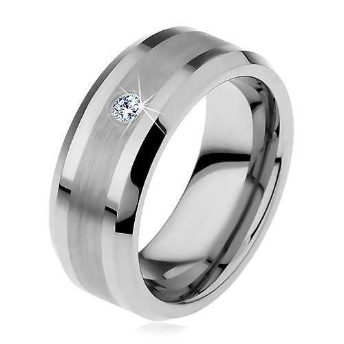 Popis produktu Wolframový prsten s matným středovým pásem a čirým zirkonem, 8 mm - Velikost: 59