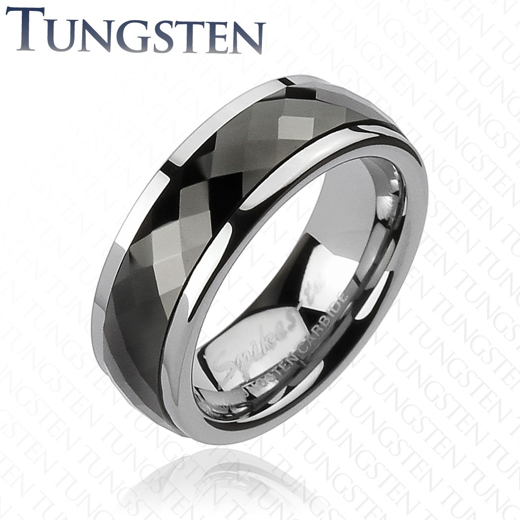 Wolframový prsten s otáčivým středem - černé kosočtverce - Velikost: 55