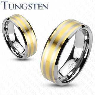 Popis produktu Wolframový prsten se dvěma pásky zlaté barvy - Velikost: 49