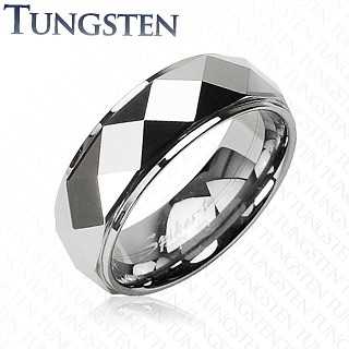 Wolframový prsten ve stříbrném barevném provedení - zkosené hrany a broušené kosočtverce.Vybírejte to nejlepší u nás. Naše heslo: kvalita, výhodná cena, prozákaznický přístup.